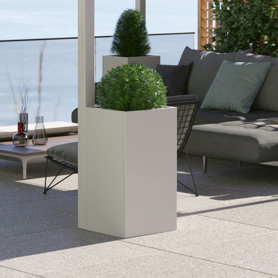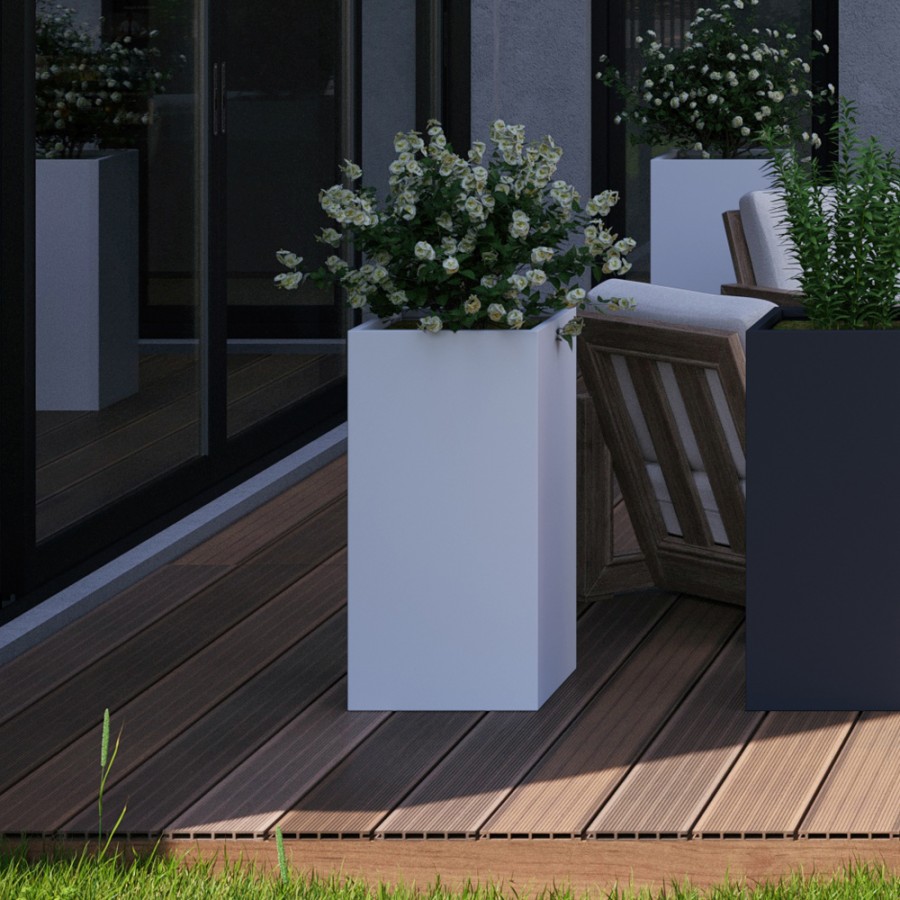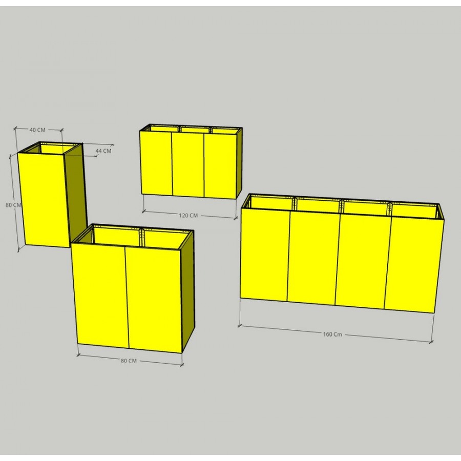 Novia Jardinières modulaires en acier galvanisé électro-galvanisé. Dimensions de 40x44x80H cm. Élégantes et minimalistes, elles sont le complément idéal pour vos espaces extérieurs et intérieurs. Excellent pour vos pergolas, avec double fond pour contrepoids et fleurs pour éviter de percer le sol. Complet avec un système innovant d'isolation chaud / froid, irrigation, drainage et réserve d'eau.