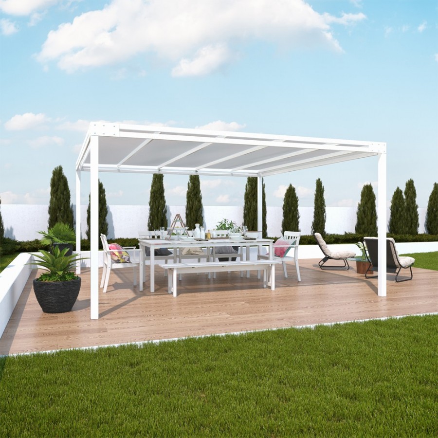 | Type de Couverture | Pergola avec un tissu d'ombrage micro-perforé fixe sur barres transversales droites. L'eau coule directement du tissu qui n'est pas imperméable. Le tissu est facilement détachable à la fin de la saison grâce aux tirants en aluminium. |
