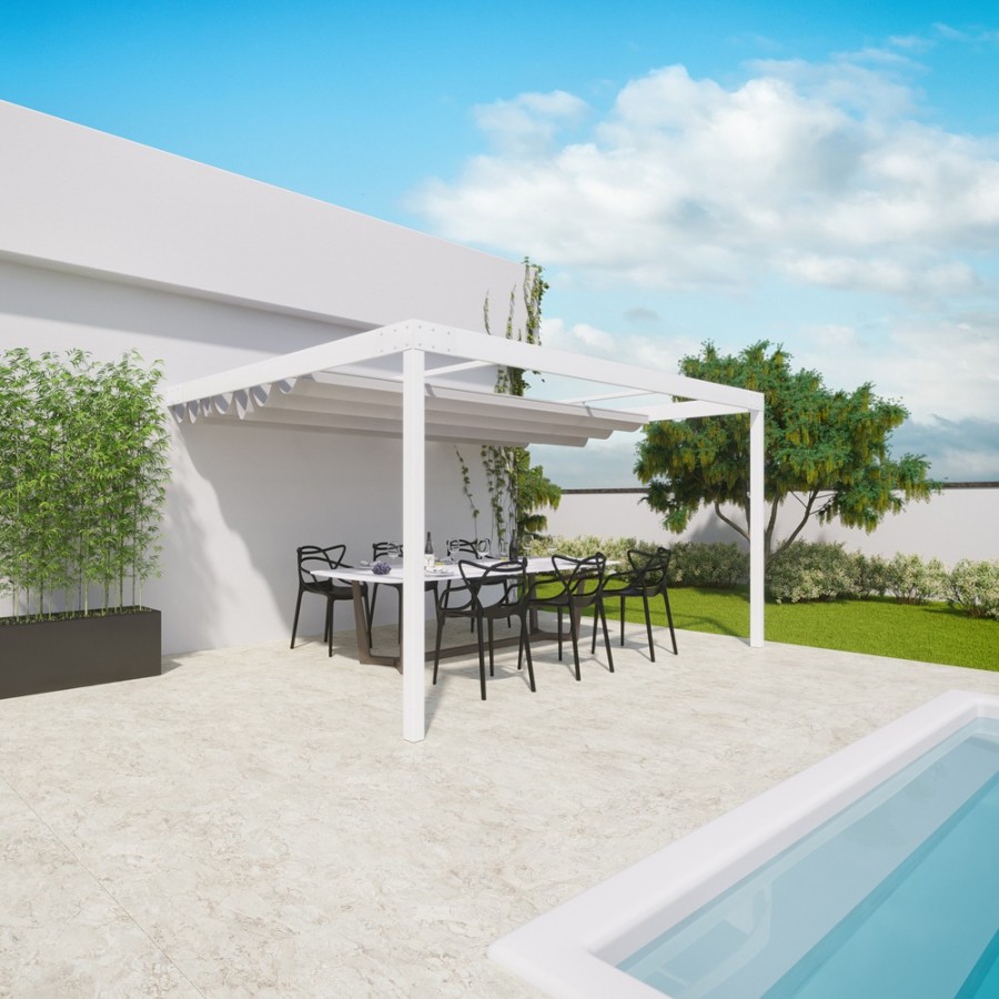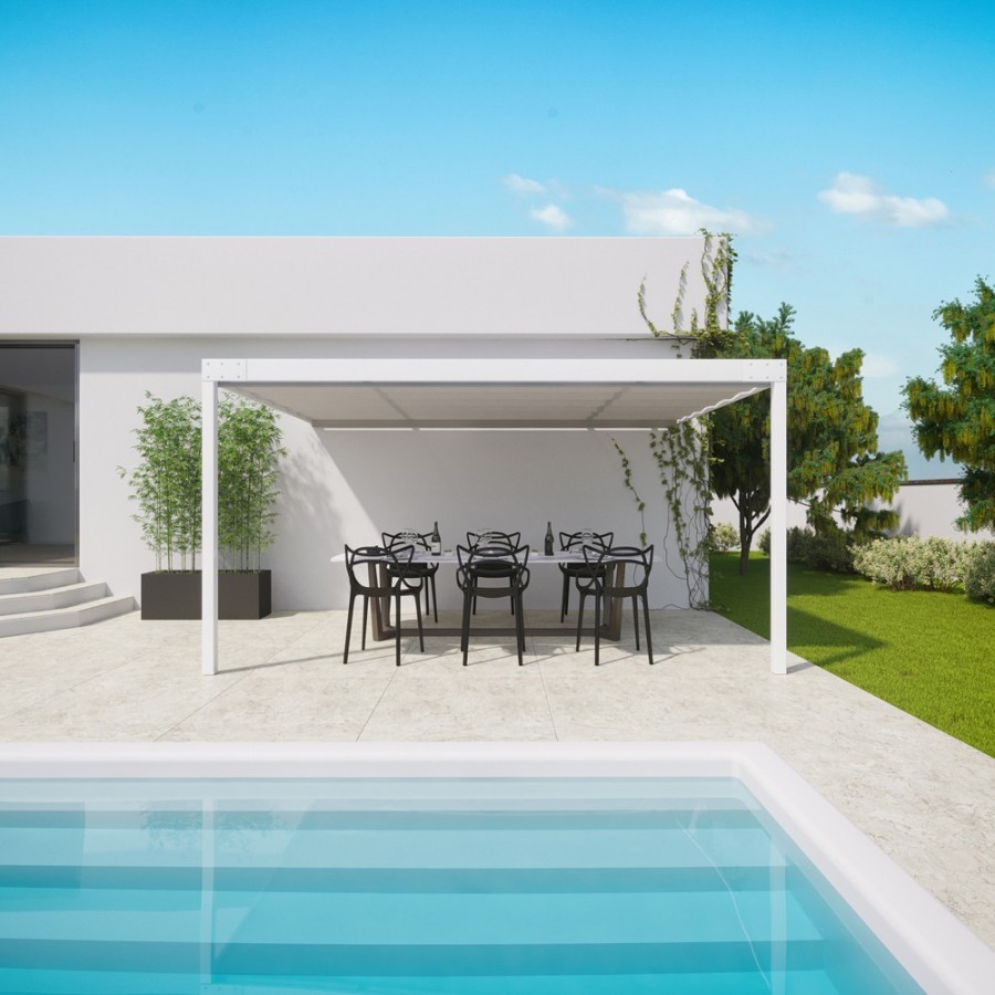 | Type de Couverture | Pergola avec toile rétractable à mouvement manuel sur guides en aluminium avec chariots à roulement silencieux. L'évacuation de l'eau s'effectue sur le côté droit du tissu. Verrouillage facile de la feuille ouverte grâce aux aimants. |