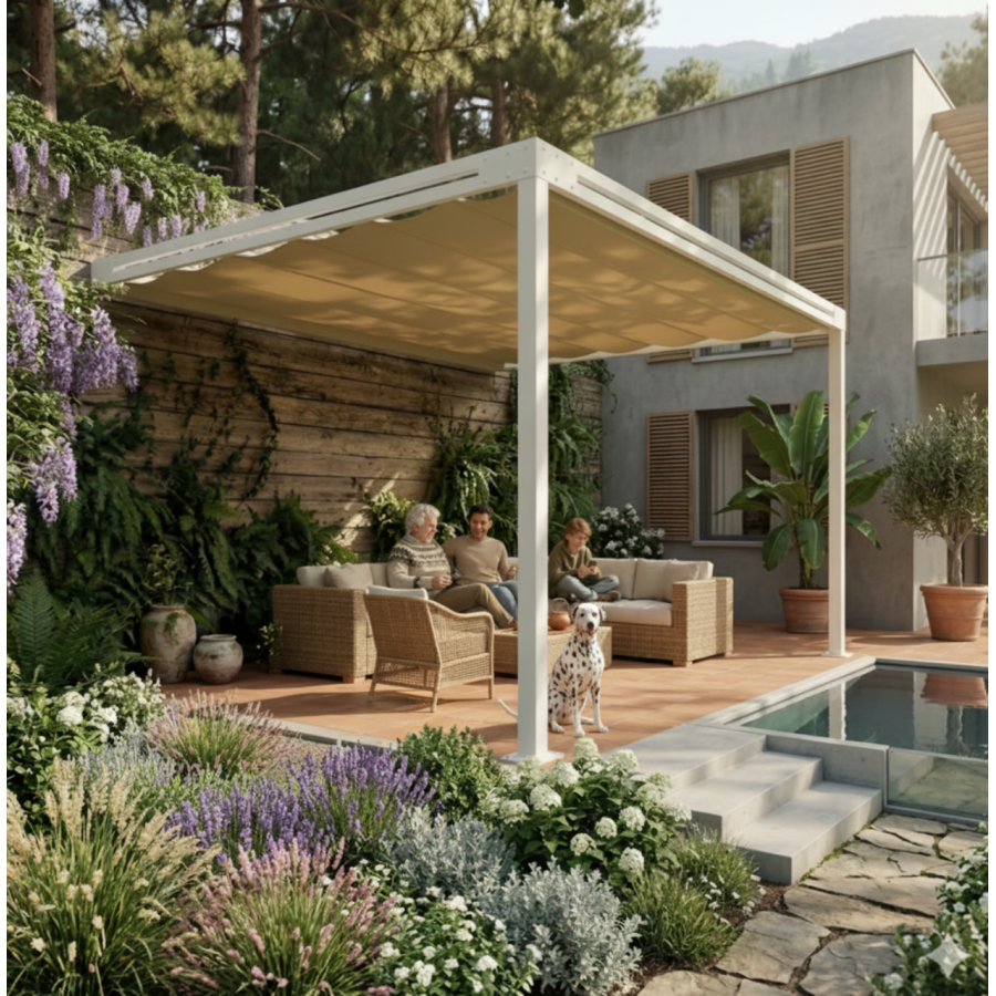 | Tipo de Cobertura | Pergola com cortina retrátil com movimento manual em guias de alumínio com carrinhos silenciosos. A drenagem da água ocorre no lado direito do tecido. Travamento fácil da folha aberta graças aos ímãs. |